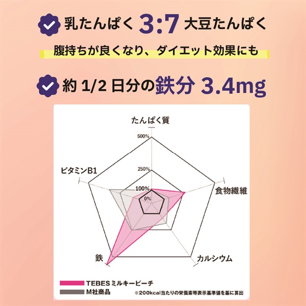 砂糖(国内製造)、ぶどう糖、フラクトオリゴ糖シロップ、植物性たんぱく、植物油脂、もも果汁、食物繊維、乳たんぱく分離物、酵母、V.K2含有食用油脂粉末、乳酸菌末/乳化剤、塩化K、リン酸Na、炭酸Mg、増粘剤(ジェラン)、V.C、香料、ピロリン酸鉄、クエン酸鉄Na、甘味料(スクラロース)、ナイアシン、V.E、パントテン酸Ca、V.B6、V.B2、V.B1、V.A、葉酸、V.D、V.B12、(一部に乳成分・大豆・ももを含む)