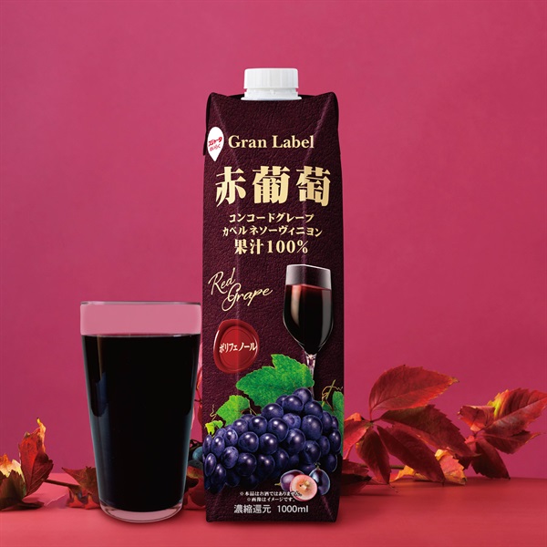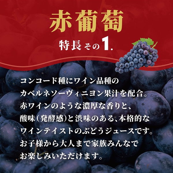 コンコード種にワイン品種のカベルネソーヴィニヨン果汁を配合。赤ワインのような濃厚な香りと、酸味(発酵感)と渋味のある、本格的なワインテイストのぶどうジュースです。