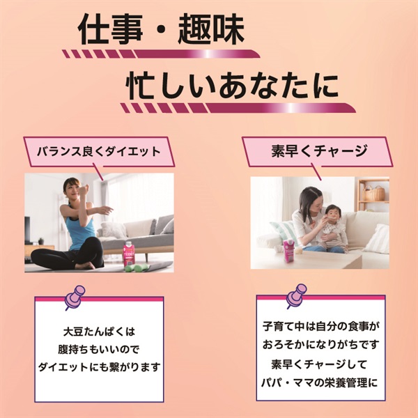砂糖(国内製造)、ぶどう糖、フラクトオリゴ糖シロップ、植物性たんぱく、植物油脂、もも果汁、食物繊維、乳たんぱく分離物、酵母、V.K2含有食用油脂粉末、乳酸菌末/乳化剤、塩化K、リン酸Na、炭酸Mg、増粘剤(ジェラン)、V.C、香料、ピロリン酸鉄、クエン酸鉄Na、甘味料(スクラロース)、ナイアシン、V.E、パントテン酸Ca、V.B6、V.B2、V.B1、V.A、葉酸、V.D、V.B12、(一部に乳成分・大豆・ももを含む)