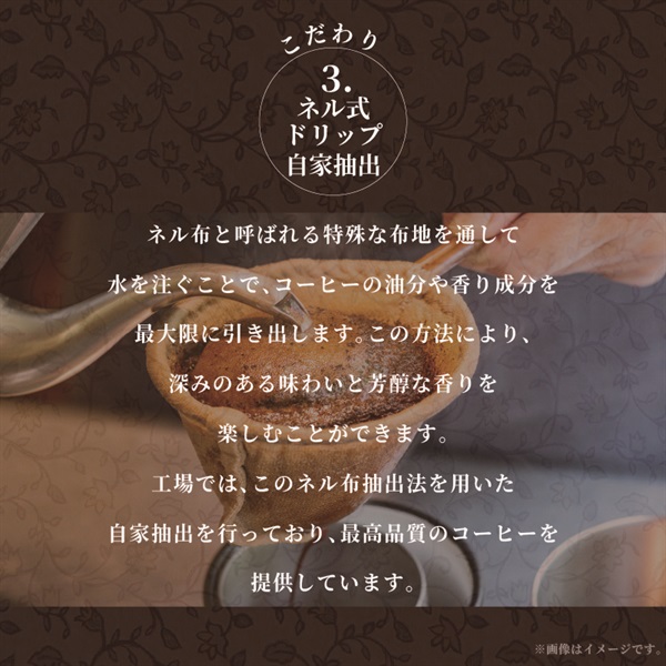 自家焙煎・自家抽出(ネル式ドリップ抽出)。