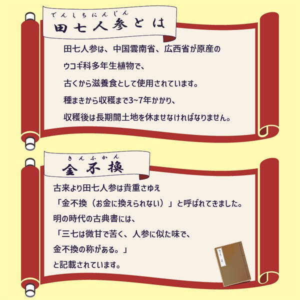 中国の明の時代に書かれた古典書には、「三七(田七人参)は、味は微甘で苦く、人参の味に似ている。また、金不換の称がある。」と記載されています。