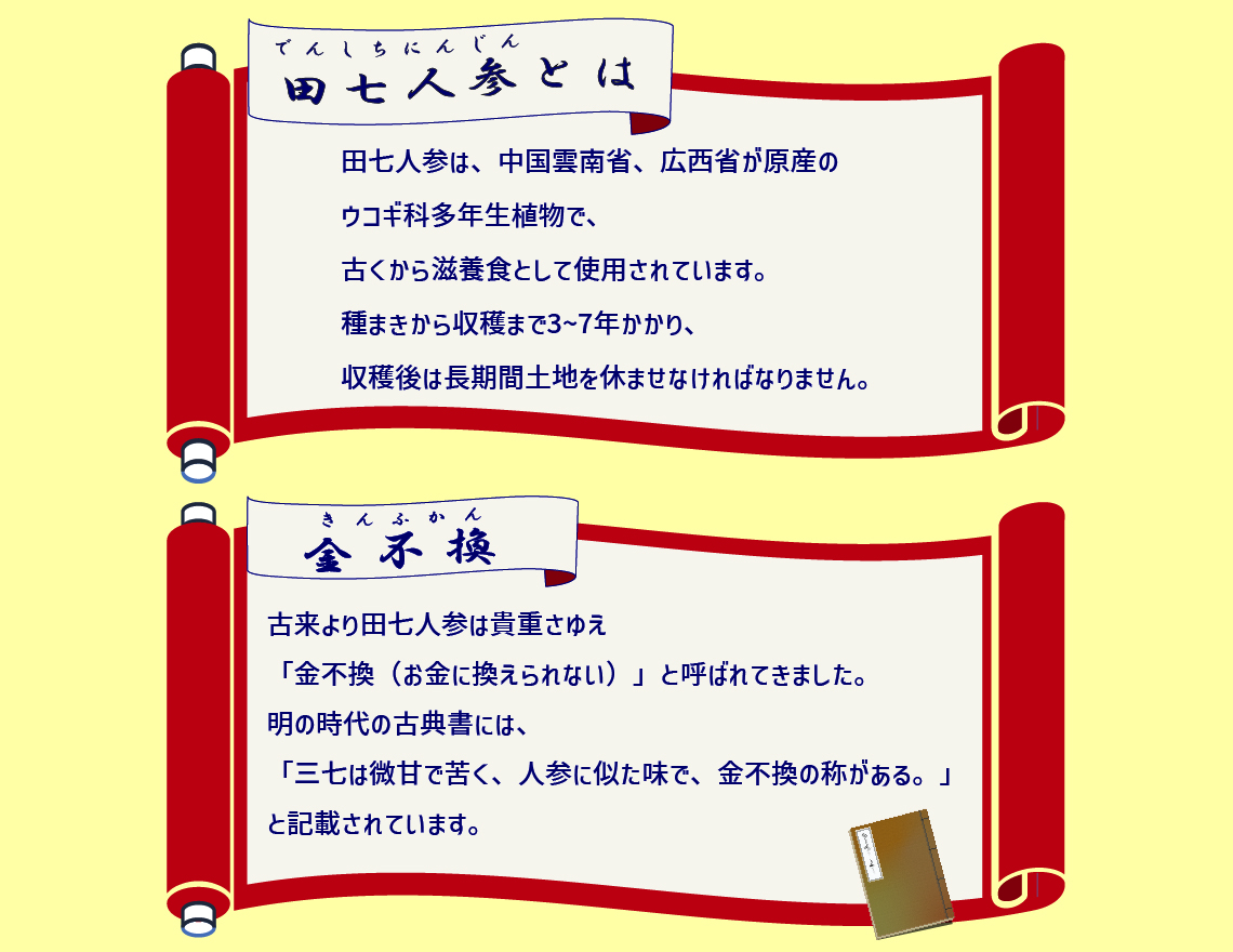 古来より田七人参は、その貴重さゆえ「金不換(お金に換えられない)」と呼ばれてきました。