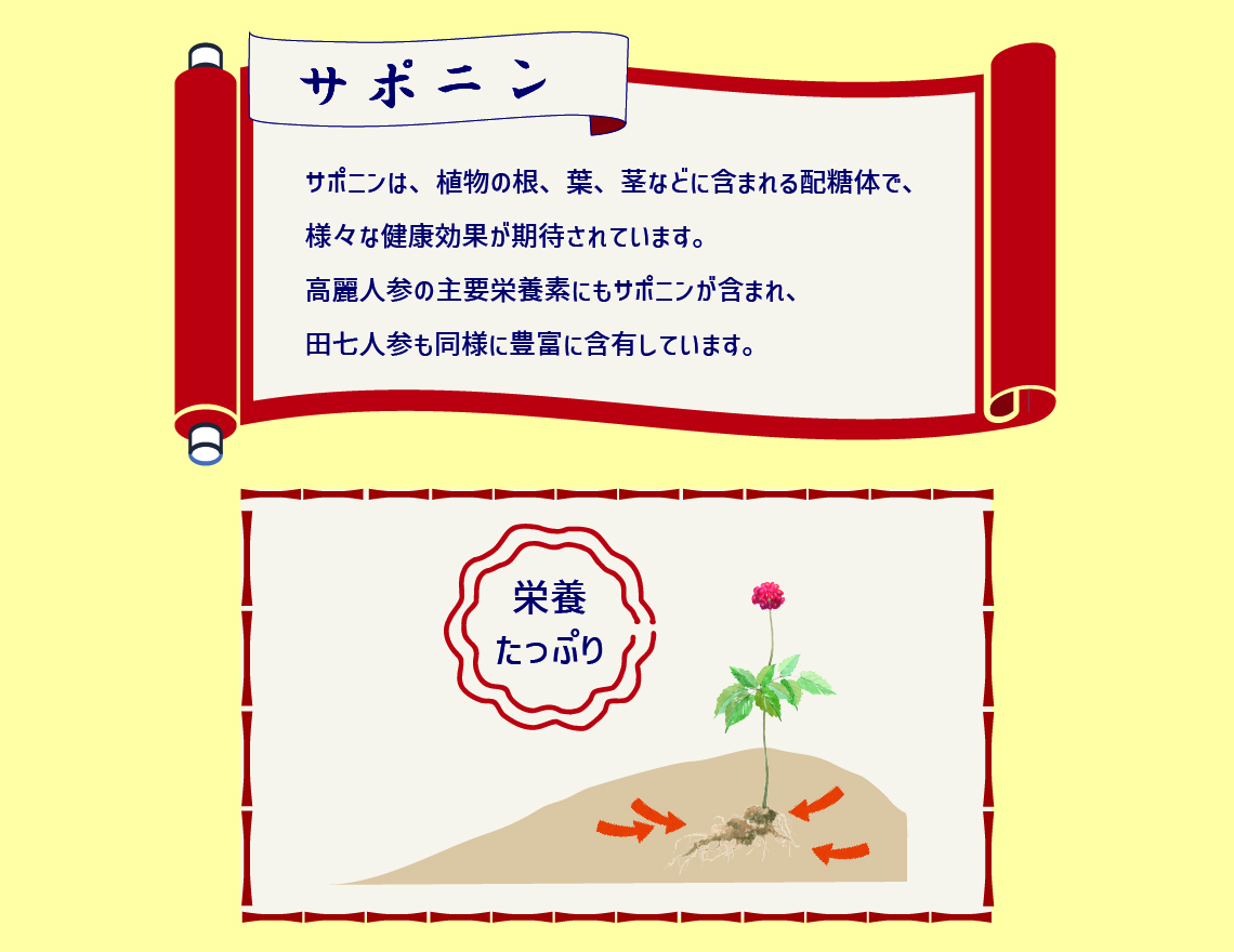 田七人参に含まれるサポニンの量は、高麗人参にも勝るとも劣らず、活力アップ、元気回復などに働きます。