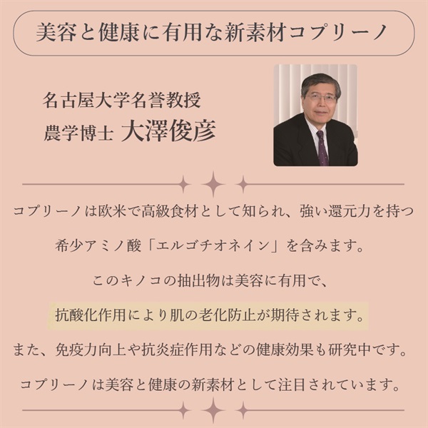 コプリーノには、特に強い還元力があり、ヒトの身体では作ることのできない希少アミノ酸「エルゴチオネイン」が含まれています。