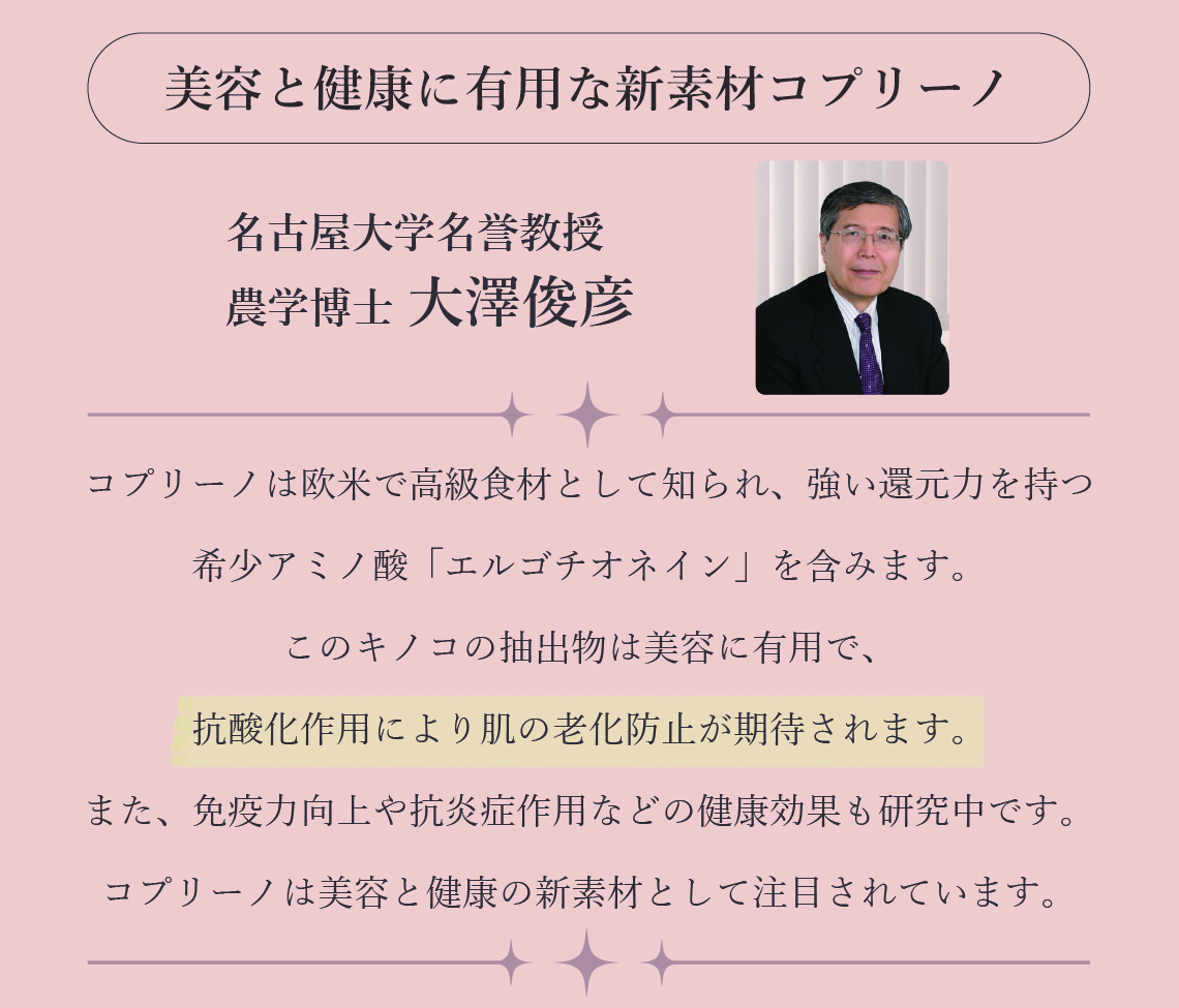 名古屋大学の研究により、コプリーノは希少アミノ酸を豊富に含むことが分かり、 美容のトラブルについての研究が進められています。