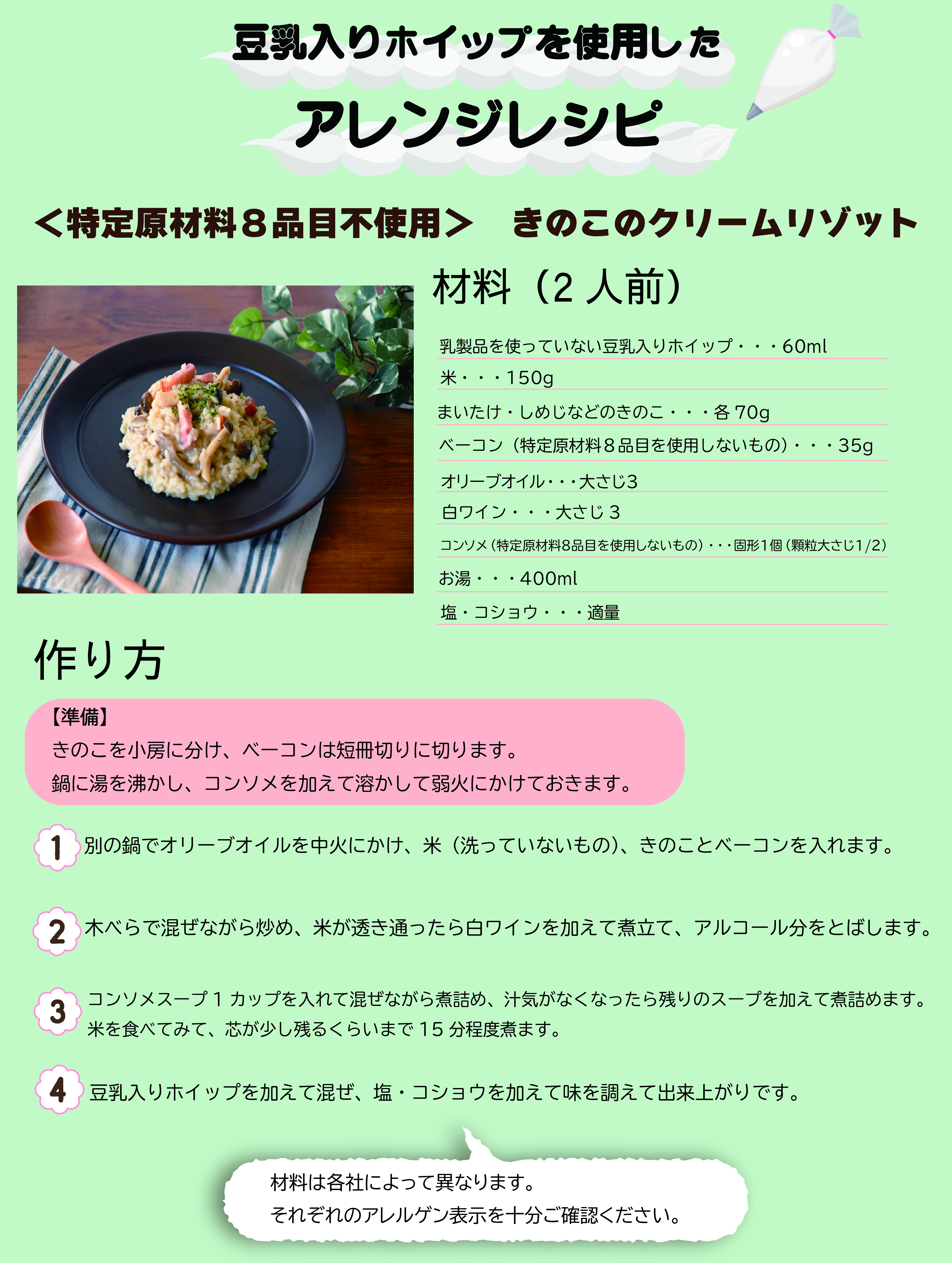 鮮やかな白色、優しい風味、マイルドな口当たりなど、乳製品では味わえない特長があります。豆乳臭さもありません。